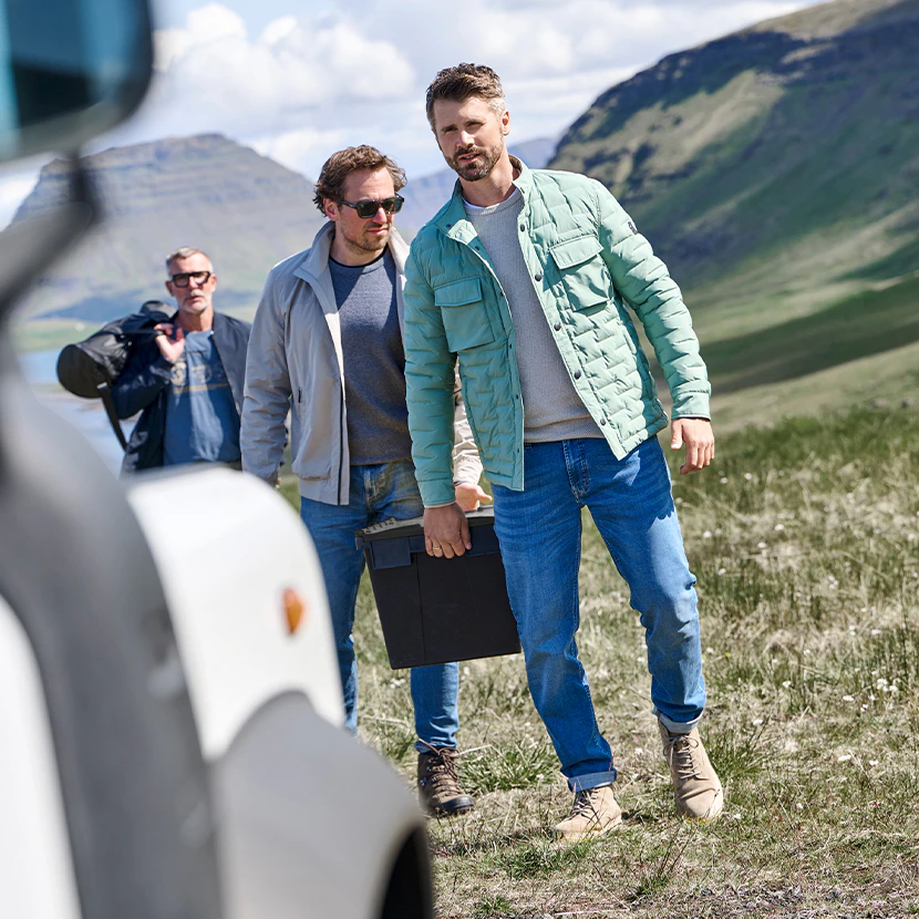 Dieser Look eignet sich perfekt für Deinen nächsten Wochenendtrip: Die gesteppte Jacke ist wind- und wasserabweisend, wärmt dank leichter Sorona-Füllung und bringt mit Stehkragen sowie zwei Brusttaschen praktische Details. Darunter sorgt der gestrickte Pullover aus reiner Baumwolle für weichen Komfort. Die Jeans mit Stretch bleibt formstabil und macht jeden Schritt mit und ergänzt den Look stilsicher.