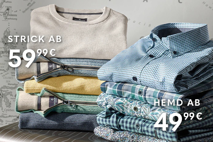 Unsere Mode setzt auf hochwertige Materialien und eine sorgfältige Verarbeitung, damit Ihre Lieblingsstücke lange gut aussehen. Pflegeleichte Qualitäten mit stabiler Passform und Farbechtheit machen Hemden, Polos, T-Shirts, Strick, Sweat und Hosen zu robusten Alltagsbegleitern – angenehm zu tragen und langlebig im Einsatz.